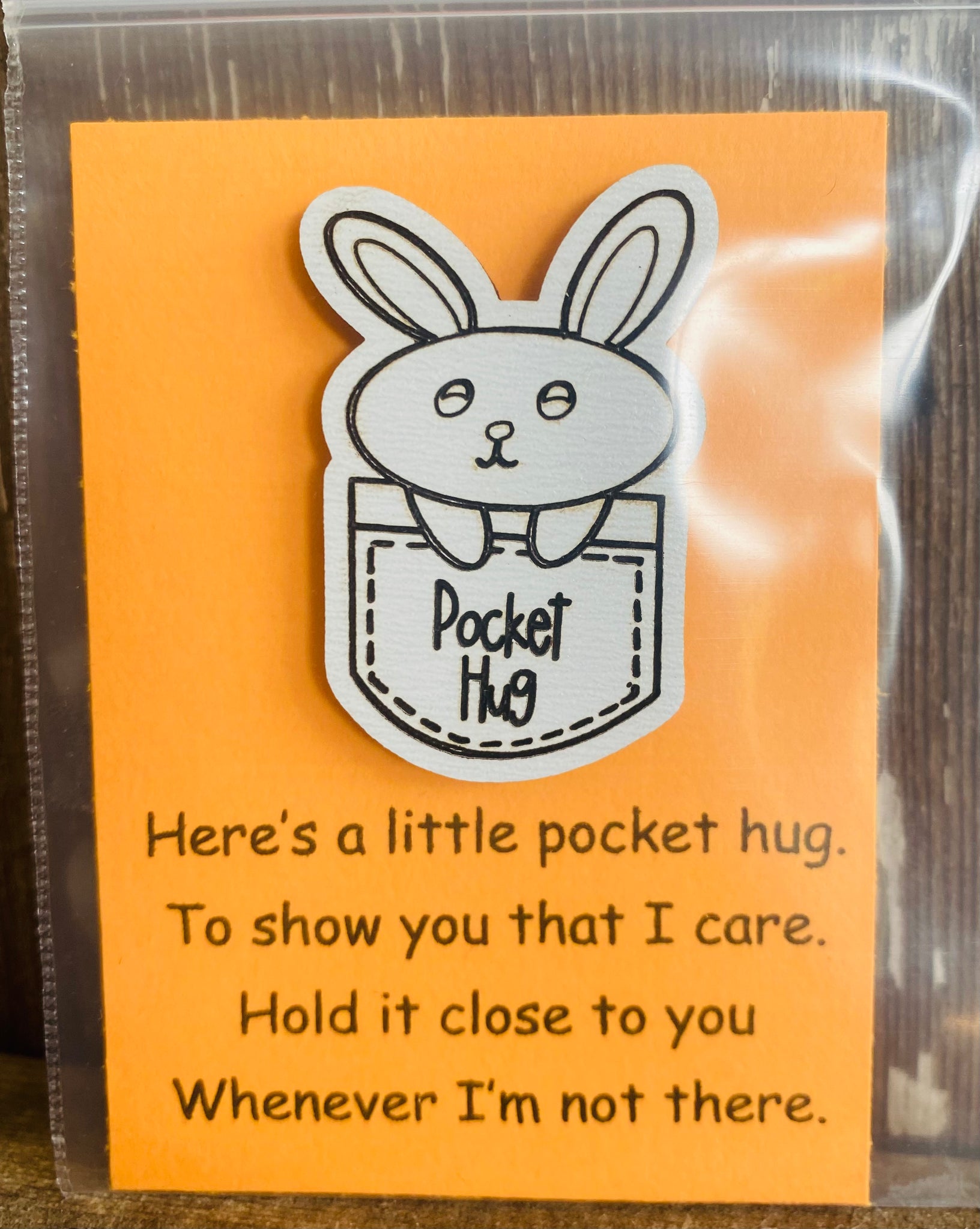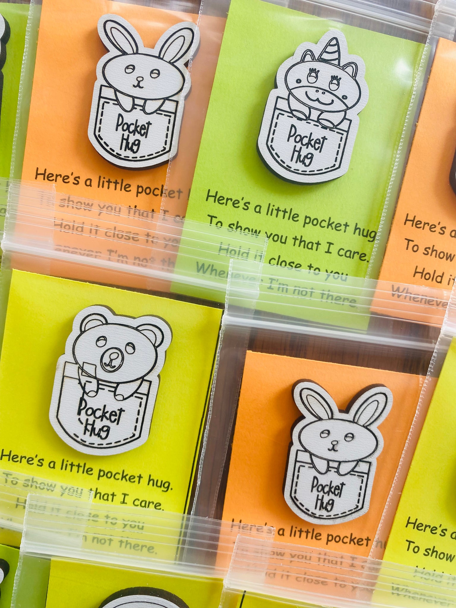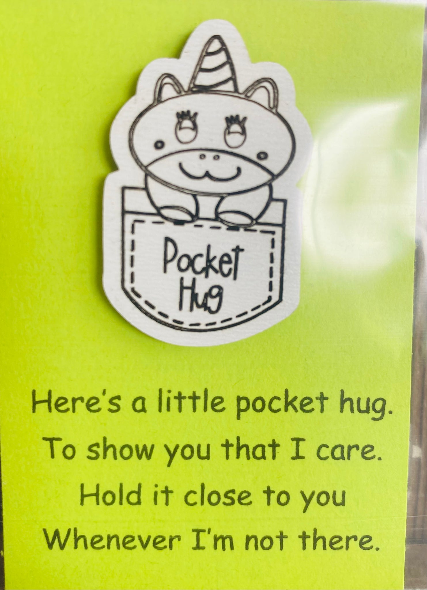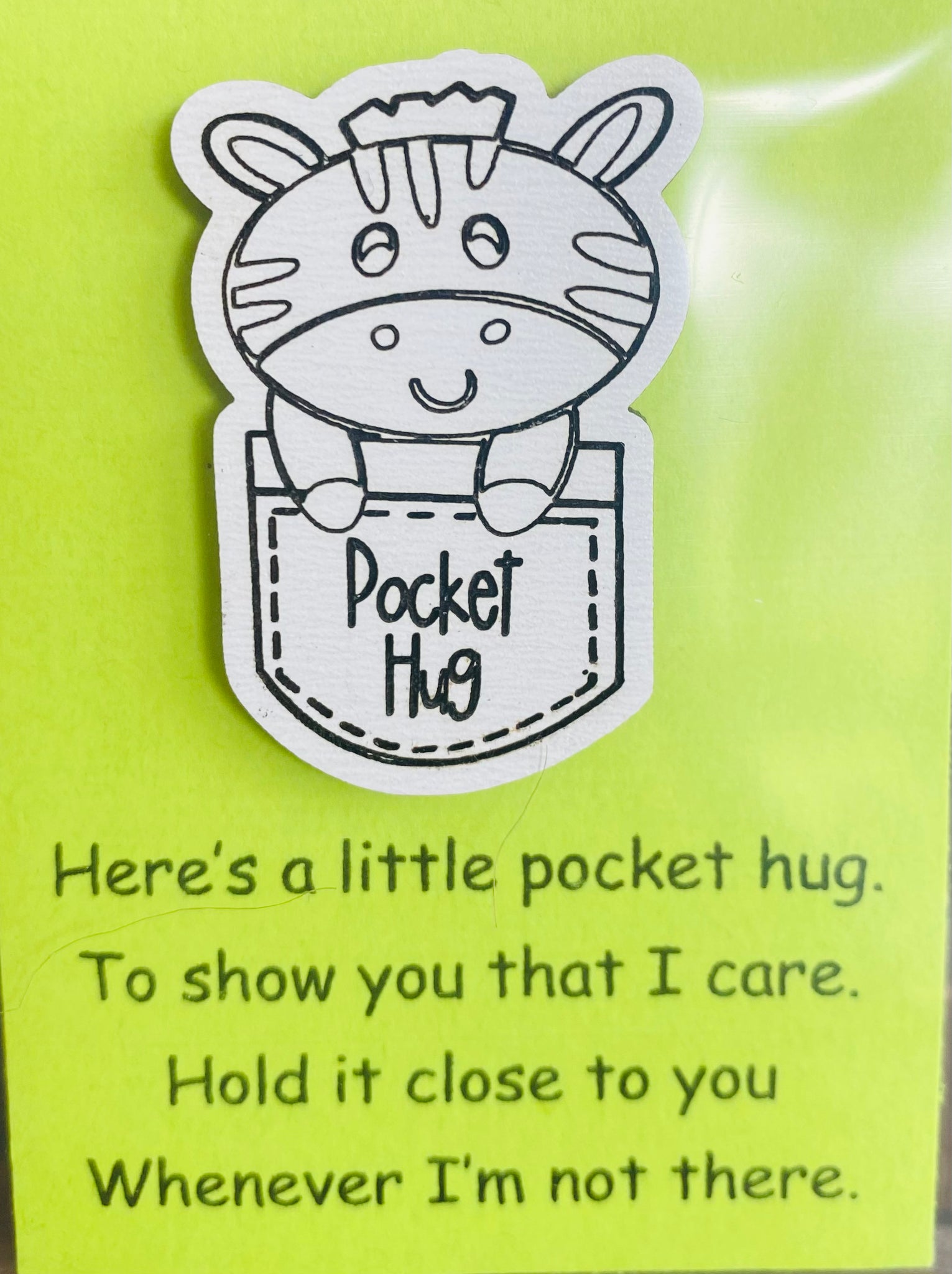 Put a smile on anyone’s face with a little pocket hug they can hold close all day long. Perfect for going to school, camp, a sleepover, or any time they’re not with you These are about 1.25” in size and can be easily removed from the paper backing.